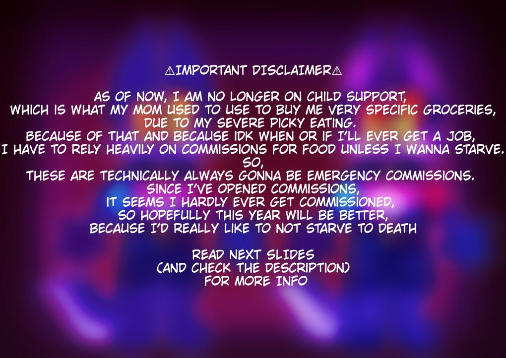 Make sure you have the money and the payment method (Cashapp or Kofi) required to pay. If i am unable to complete a commission for any reason, you will get a full refund-If i have not listed something on my will/won’t draw that you would like for me to draw or if there’s something in the rules I haven’t said that you would like to know, please ask if i am able to do what you want and provide details-I usually post almost any art that I do, so please tell me if you want me to post any finished commissions or not